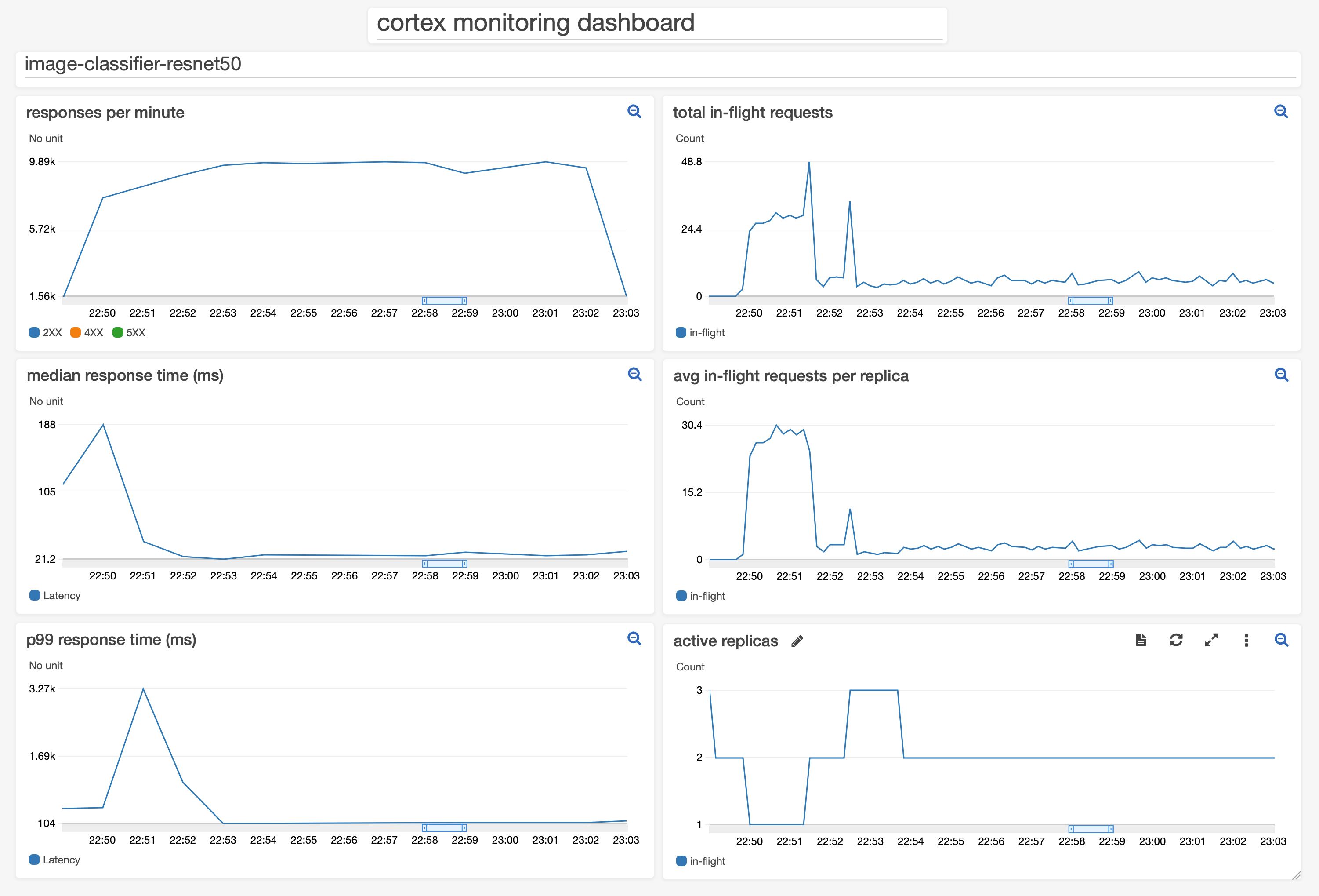 The referenced widget is aggregated over 10 second intervals because each replica reports its in-flight requests once per 10 seconds. This plot is only available for the last 3 hours (because second-granular data is aggregated to minute-granular data after 3 hours). To plot data older than 3 hours, instead change the period to 1 minute, and divide the y-axis by 6 to (since the metrics are reported every 10 seconds).*
