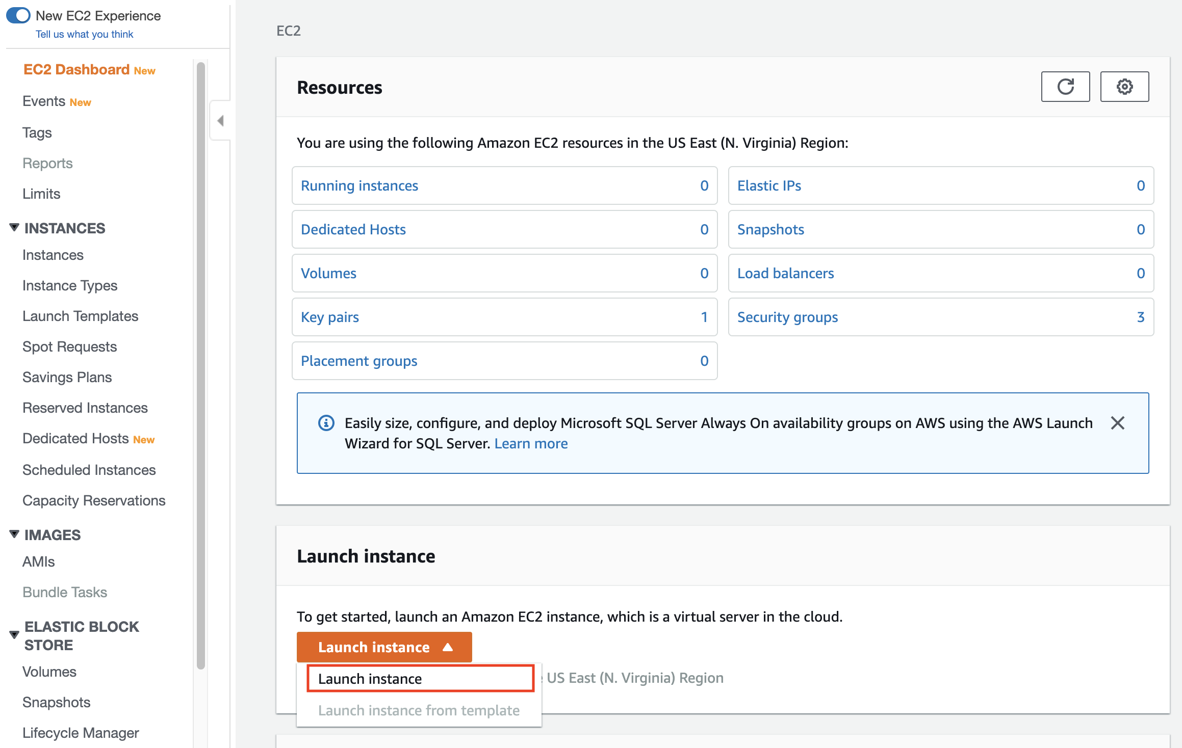 Navigate to the EC2 dashboard in your AWS Web Console and click "Launch instance".