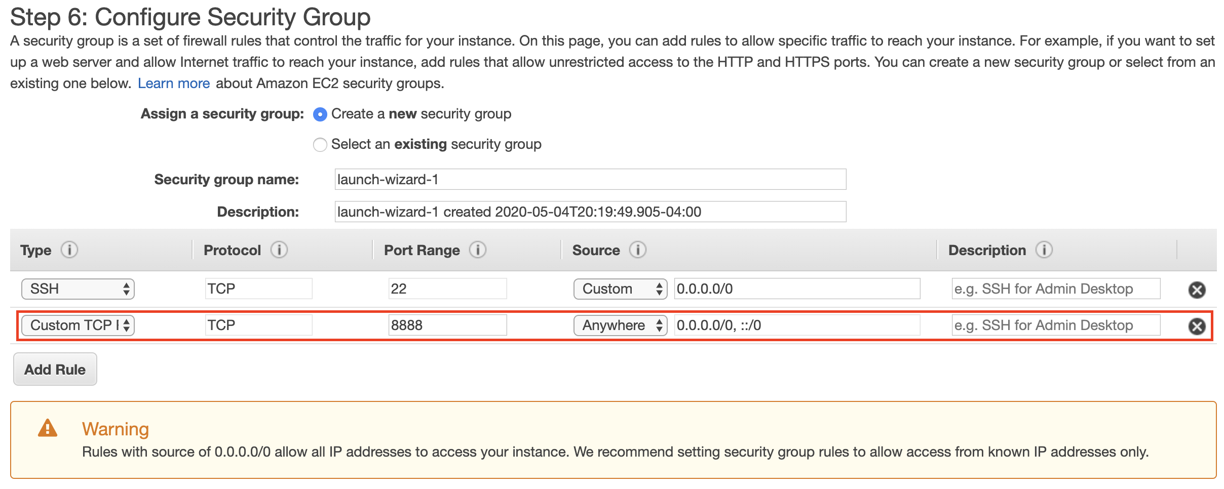 Configure your security group to allow inbound traffic to the local_port number you specified in your cortex.yaml (the default is 8888 if not specified). Exposing this port allows you to make requests to your API but it also exposes it to the world so be careful. Then click "Next: Review and Launch".