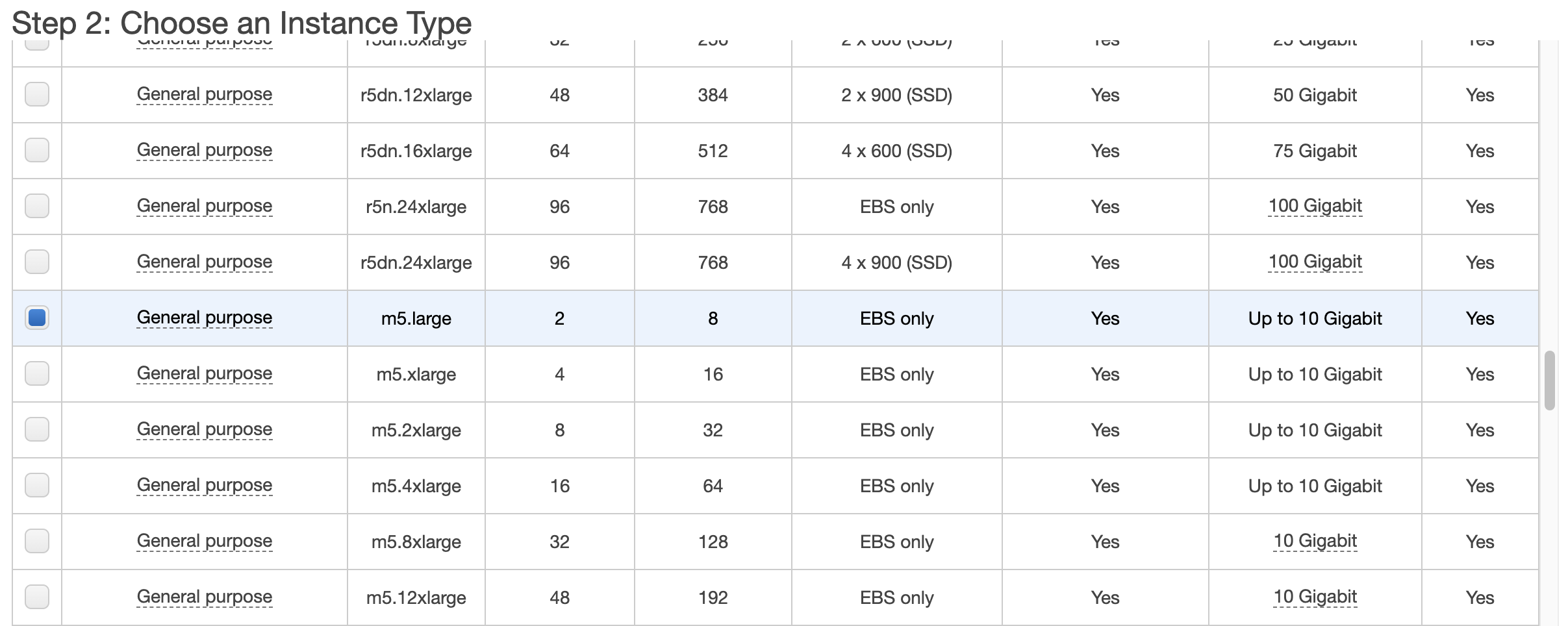 Choose your desired instance type (it should have enough CPU and Memory to run your model). Typically it is a good idea have at least 1 GB of memory to spare for your operating system and any other processes that you might want to run on the instance. To run most Cortex examples, an m5.large instance is sufficient.