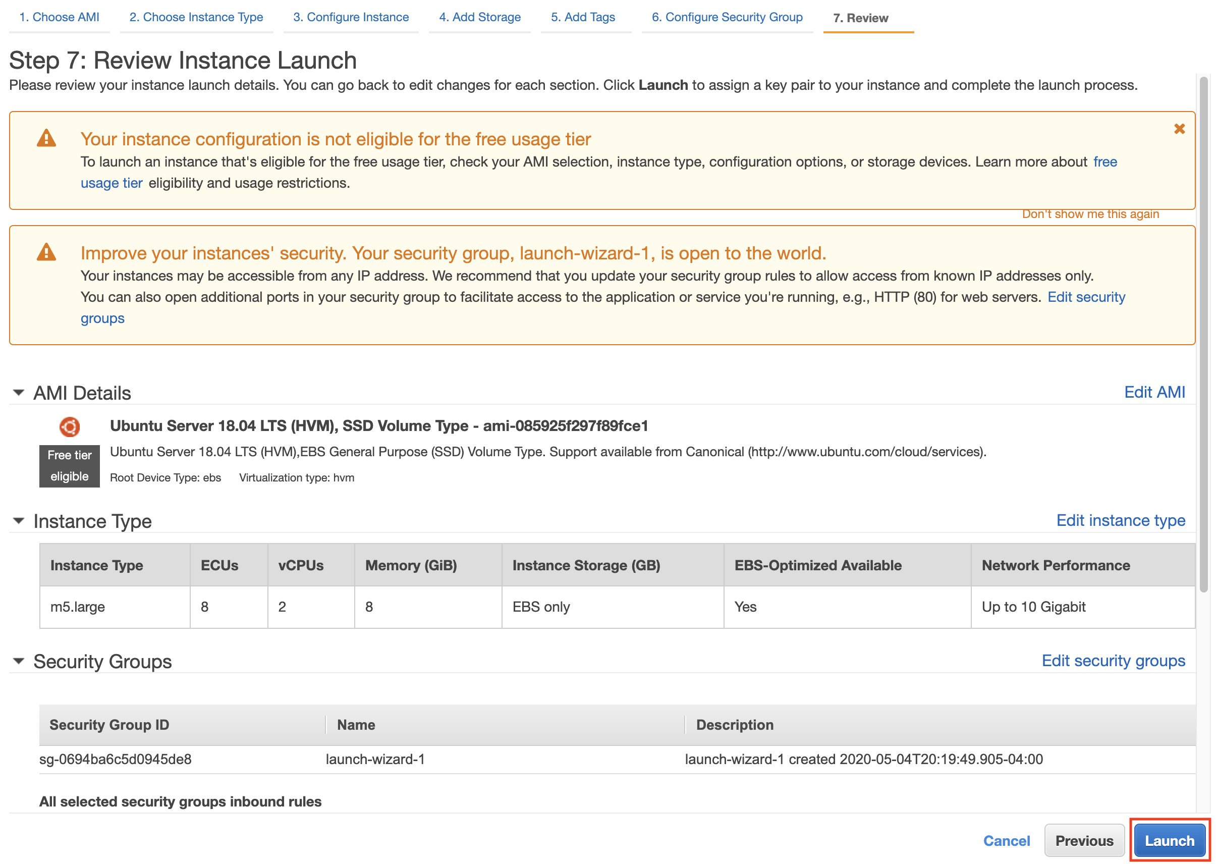 Double check details such as instance type, CPU, Memory, and exposed ports. Then click "Launch".