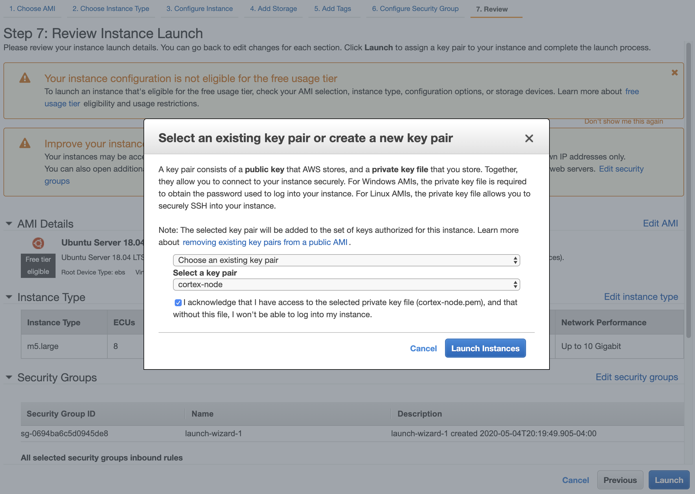 You will be prompted to select a key pair, which is used to connect to your instance. Choose a key pair that you have access to. If you don't have one, you can create one and it will be downloaded to your browser's downloads folder. Then click "Launch Instances".