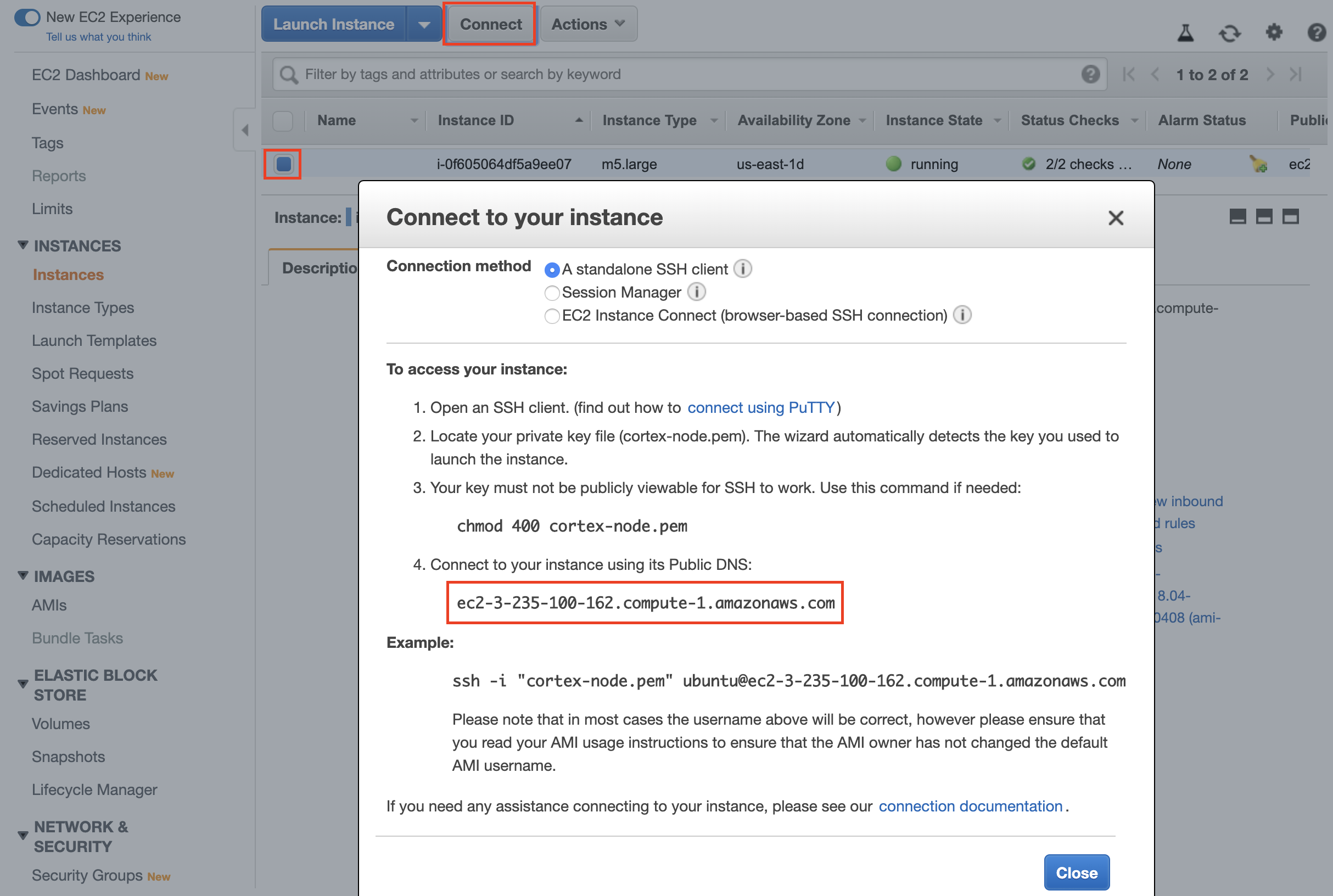 # make sure you have .ssh folder$ mkdir -p ~/.ssh​# if your key was downloaded to your Downloads folder, move it to your .ssh folder$ mv ~/Downloads/cortex-node.pem ~/.ssh/​# modify your key's permissions$ chmod 400 ~/.ssh/cortex-node.pem​# get your instance's public DNS and then ssh into it$ ssh -i "cortex-node.pem" [email protected]