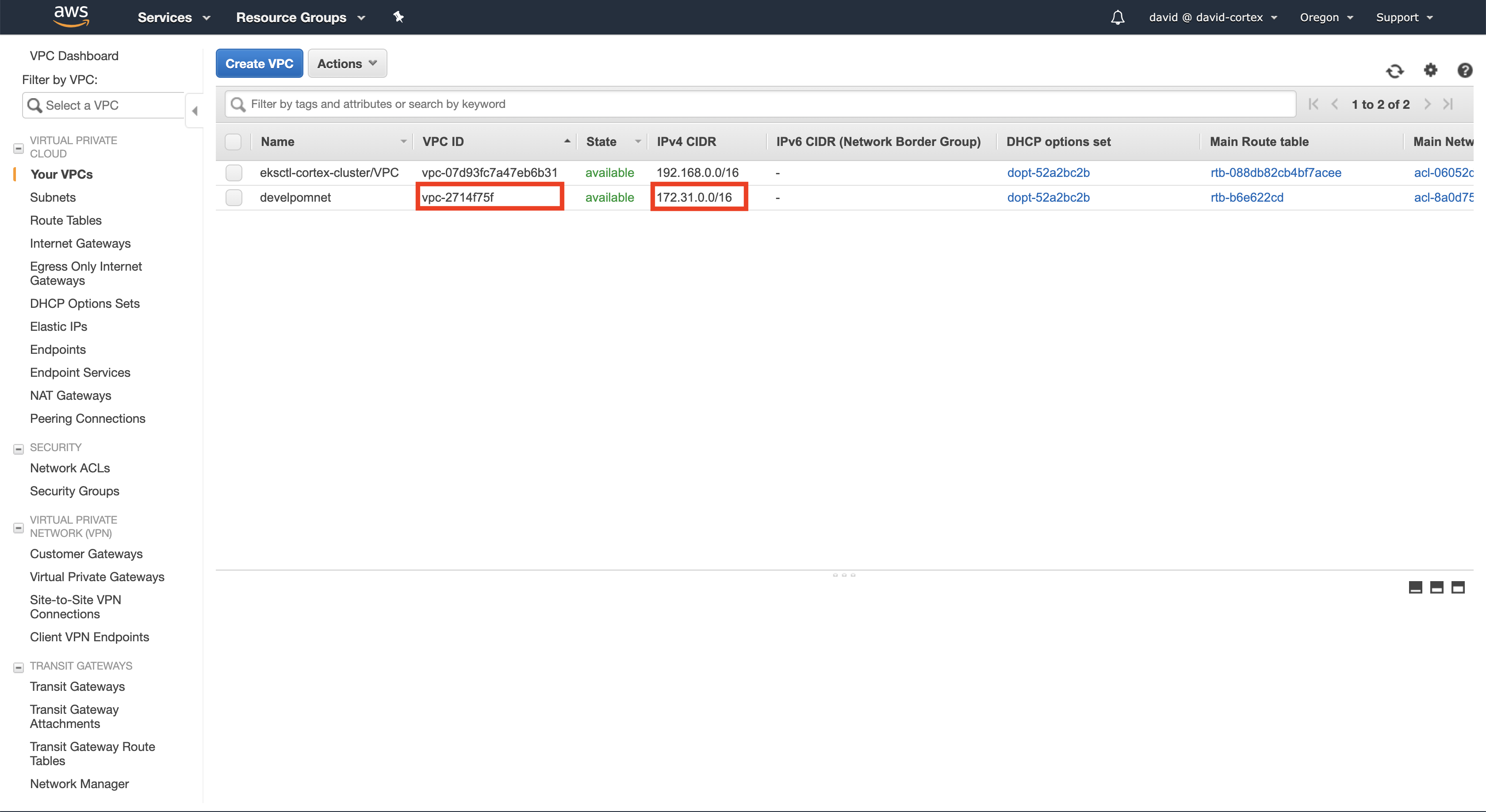 Navigate to AWS's VPC dashboard and identify the ID and CIDR block of Cortex's VPC:
