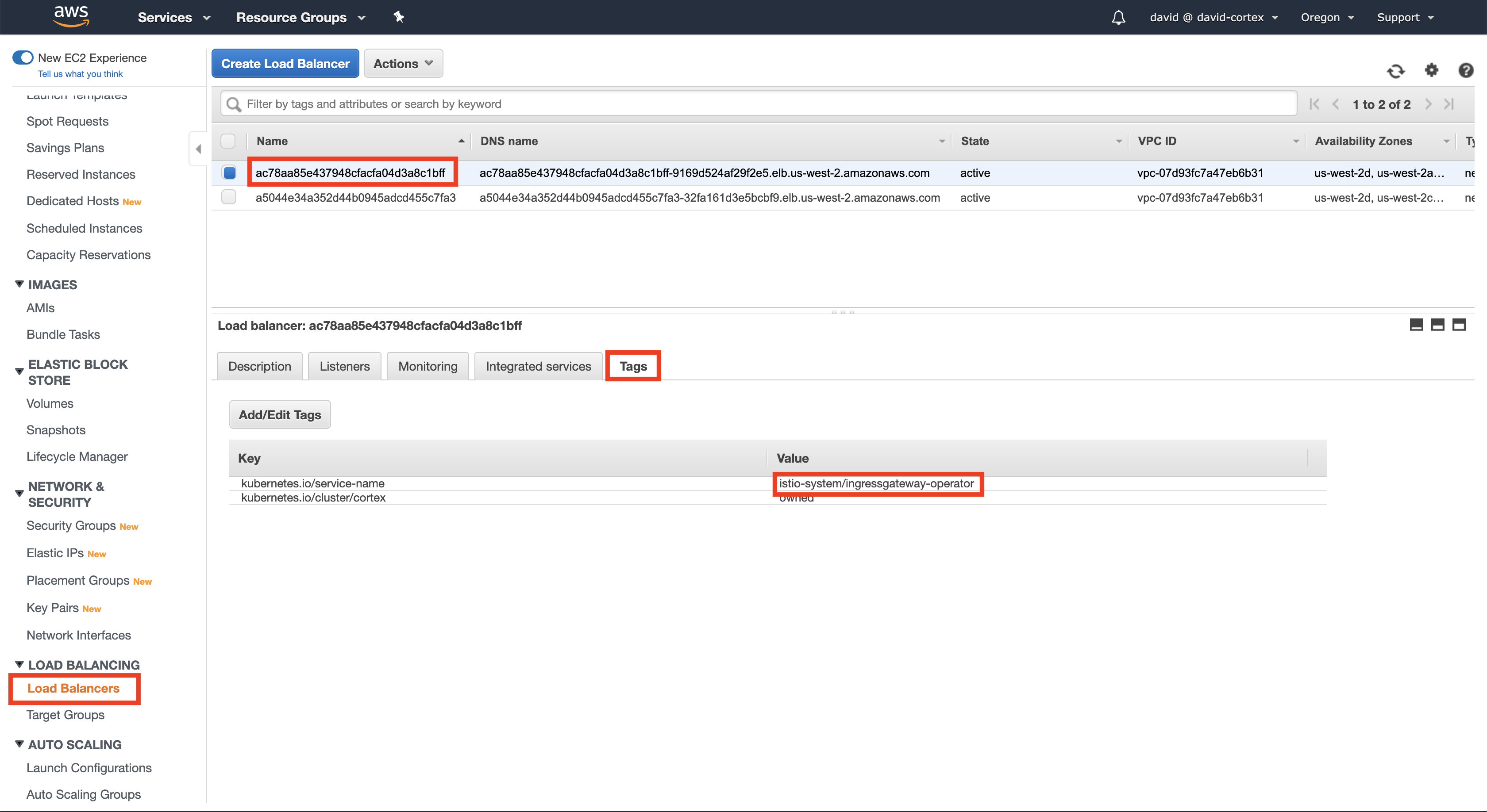 Navigate to AWS's EC2 Load Balancer dashboard and locate the Cortex operator's load balancer. You can determine which is the operator load balancer by inspecting the kubernetes.io/service-name tag: