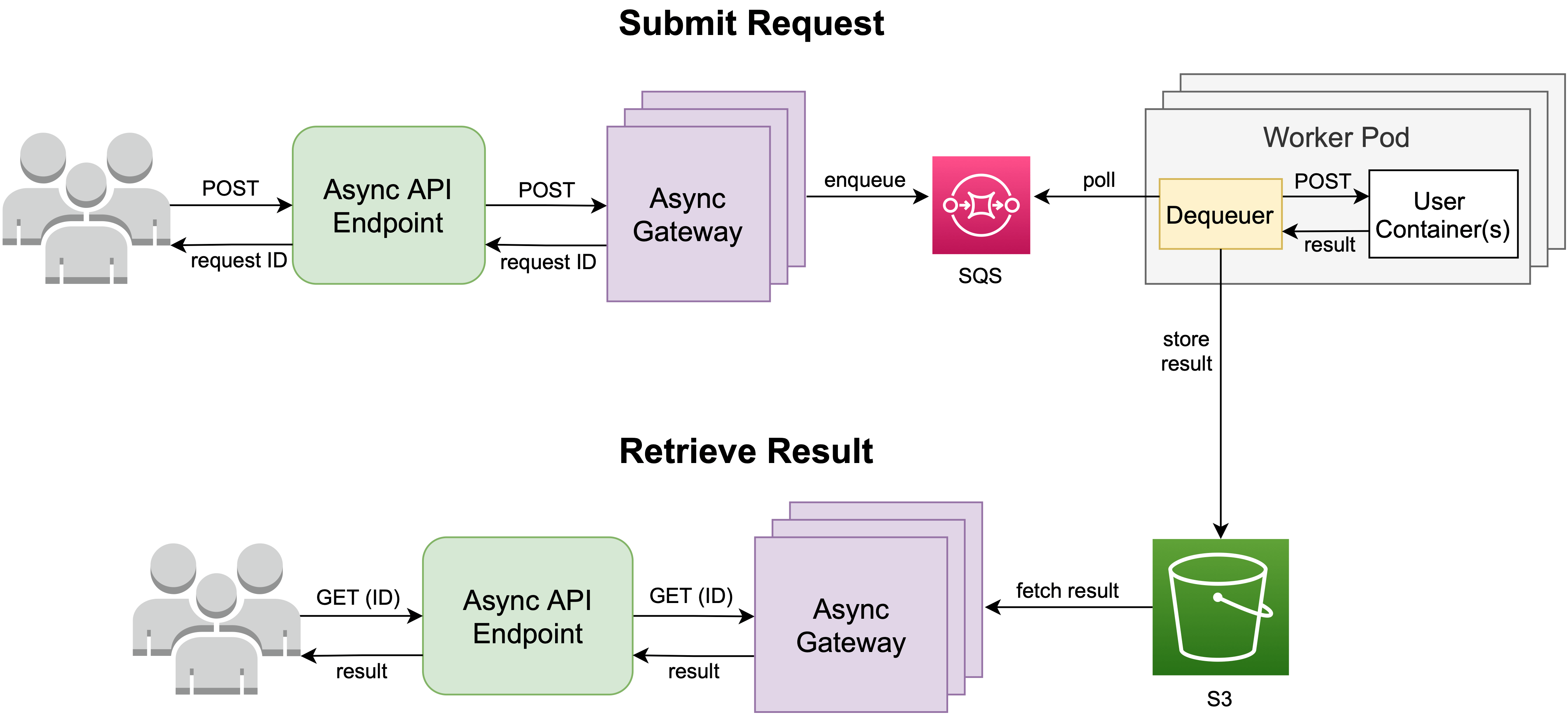 The dequeuer sidecar in the worker pod will pull the request from the SQS queue, download the request's payload from S3, and make a POST request to your containers. After the dequeuer receives a response, the corresponding request payload will be deleted from S3 and the response will be saved in S3 for 7 days.