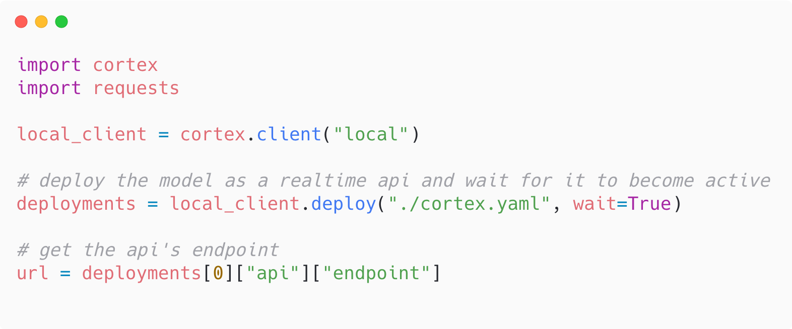 For example, for reasons we’ve explained before, Cortex APIs are written as Python scripts with YAML manifests, not notebooks, and are deployed via a CLI.